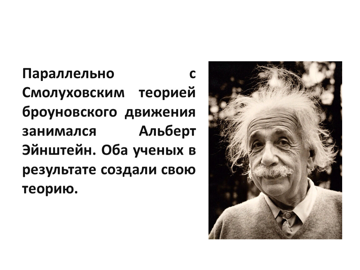 Параллельно с Смолуховским теорией броуновского движения занимался Альберт Эйнштейн. Оба ученых в результате создали свою теорию.