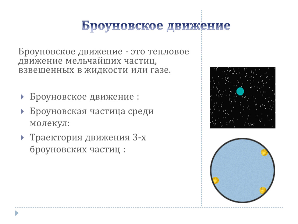 Броуновское движение - это тепловое движение мельчайших частиц, взвешенных в жидкости или газе.