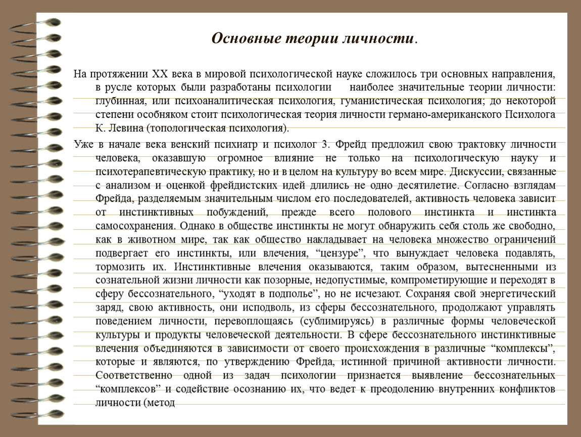 На протяжении XX века в мировой психологической науке сложилось три основных направления, в русле которых были разработаны психологии наиболее значительные теории личности: глубинная, или психоаналитическая психология, гуманистическая психология; до некоторой степени особняком стоит психологическая теория личности германо-американского Психолога К. Левина (топологическая психология).