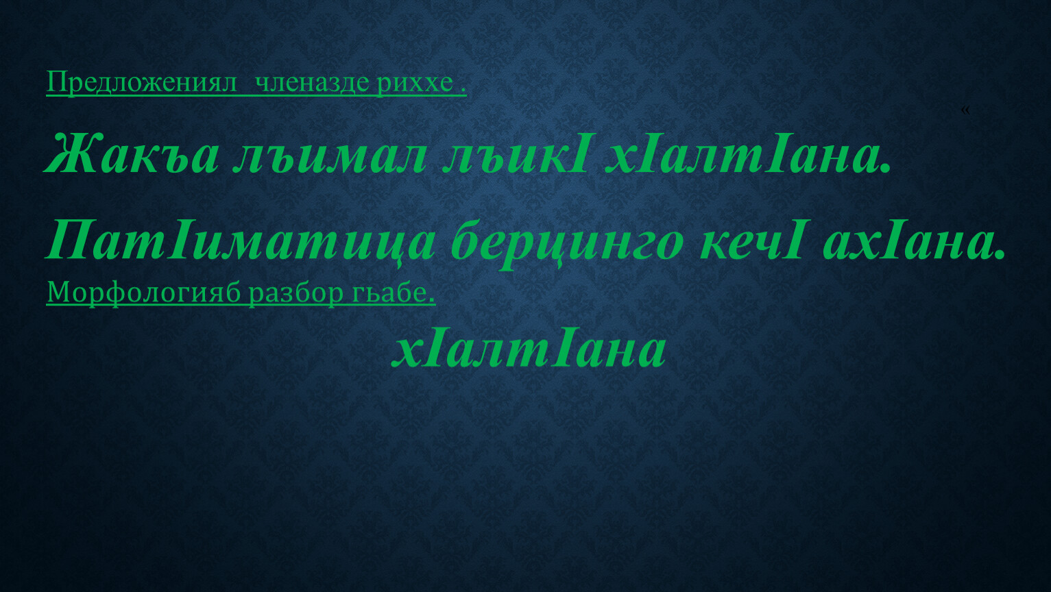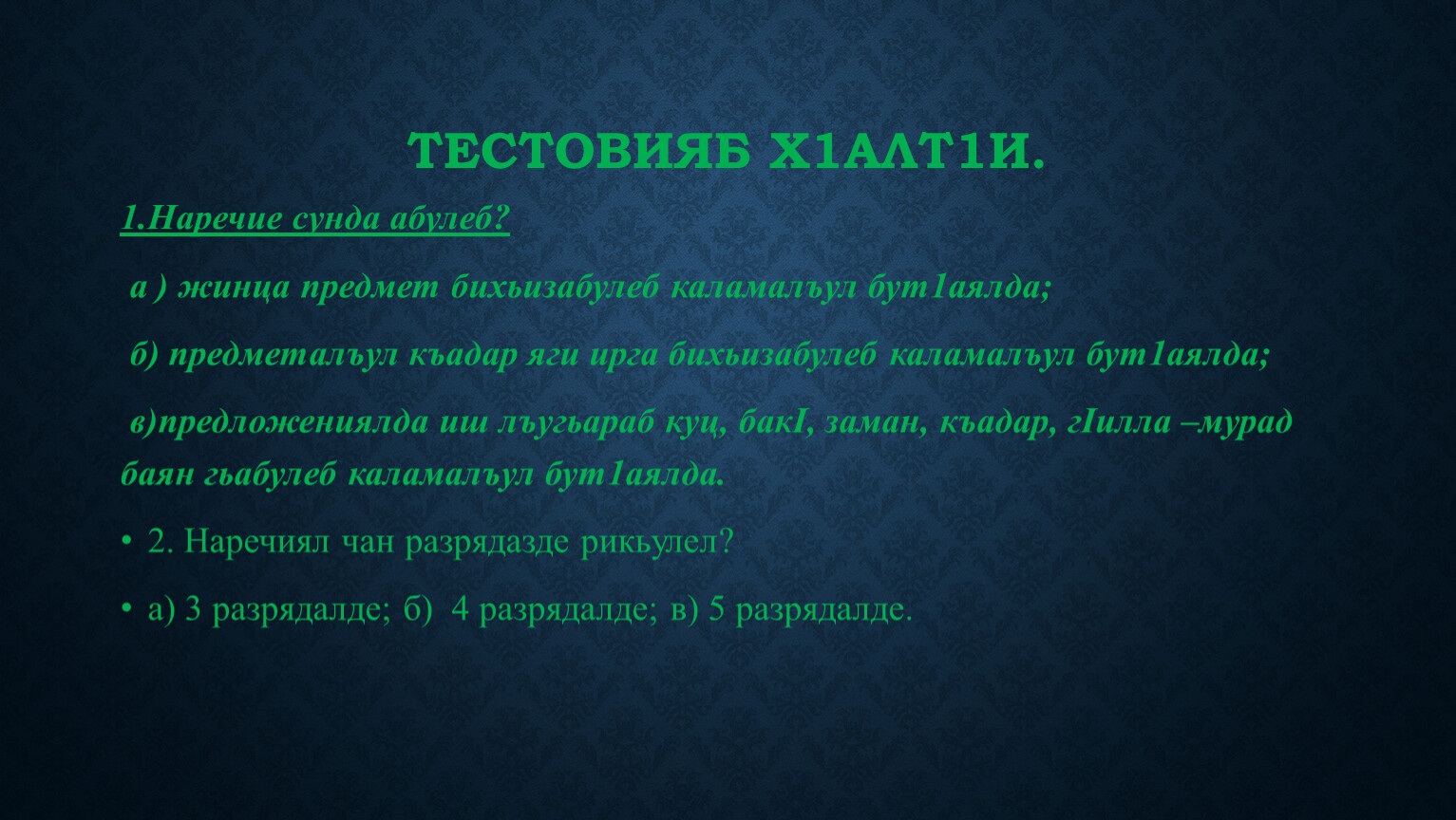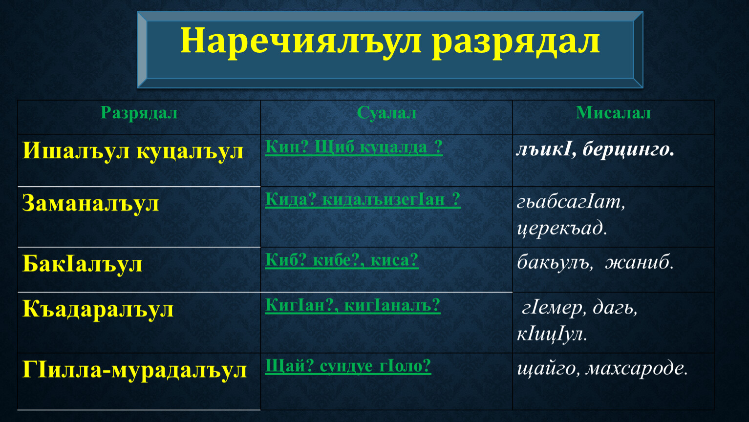 в)предложениялда иш лъугьараб куц, бакI, заман, къадар, гIилла –мурад баян гьабулеб каламалъул бут1аялда.