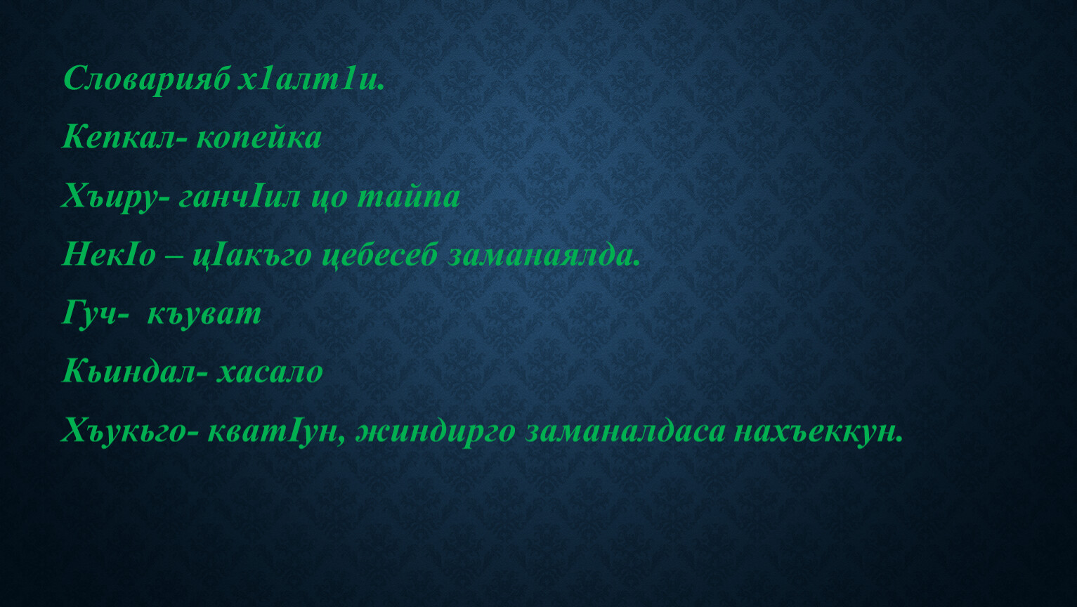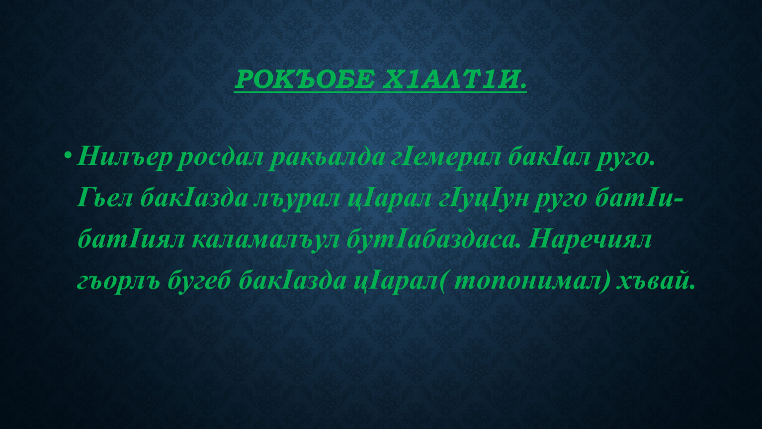 Къадаралъул | КигIан?, кигIаналъ? | гIемер, дагь, кIицIул. |