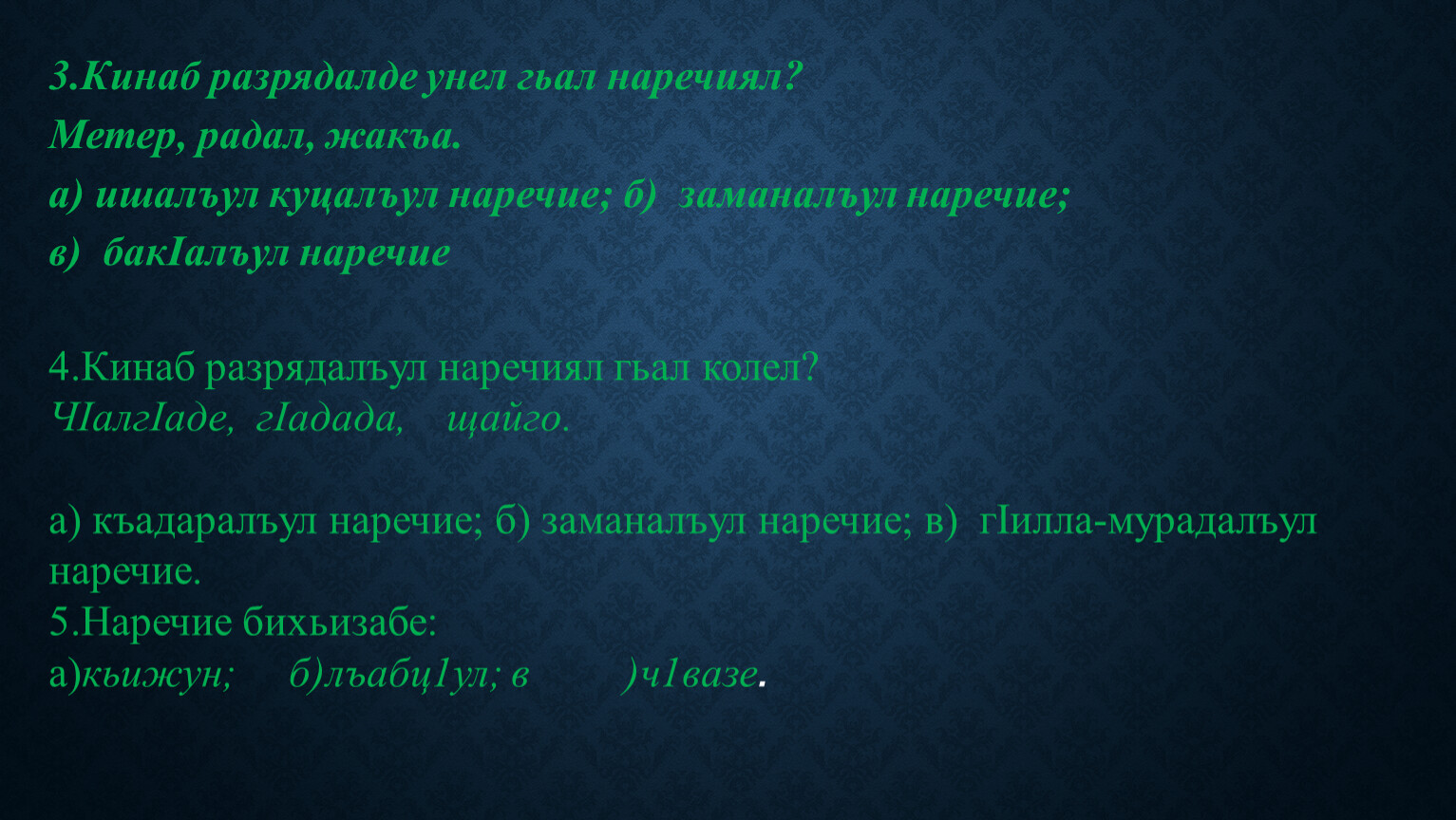 а) ишалъул куцалъул наречие; б) заманалъул наречие;