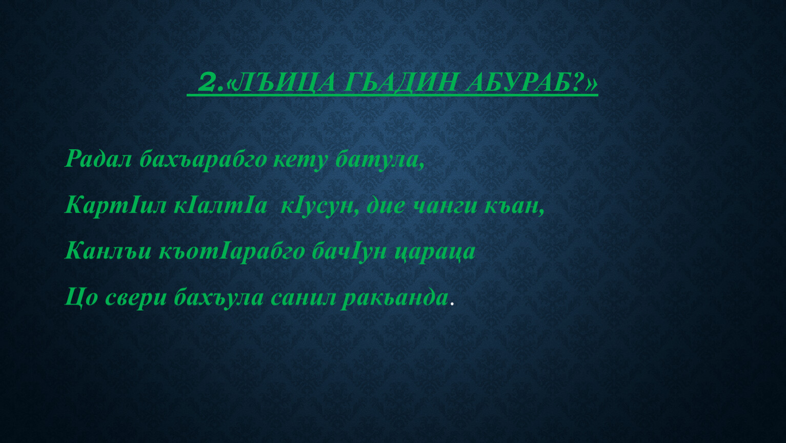Ишалъул куцалъул | Кин? Щиб куцалда ? | лъикI, берцинго. |