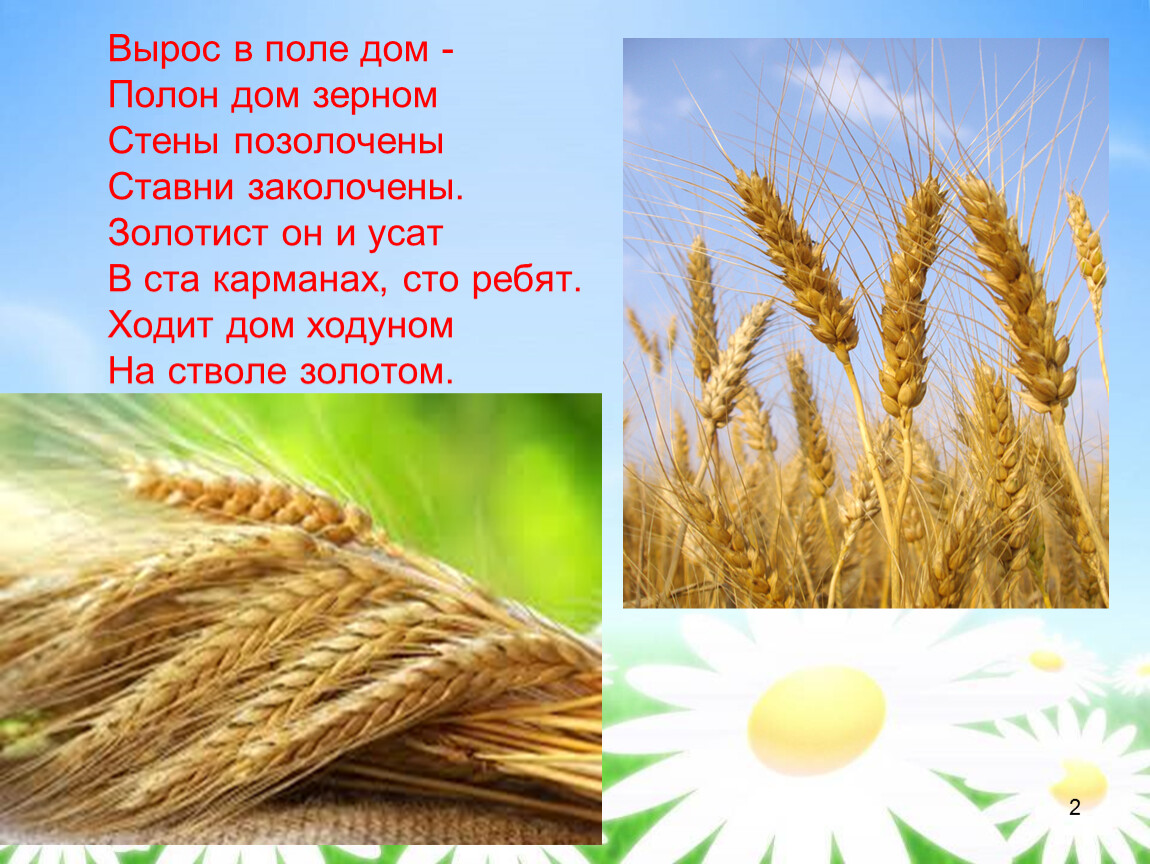 Вырос в поле дом -Полон дом зерномСтены позолоченыСтавни заколочены.Золотист он и усатВ ста карманах, сто ребят.Ходит дом ходуномНа стволе золотом.