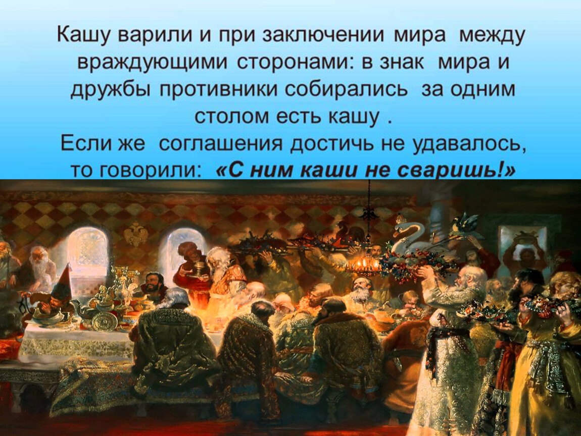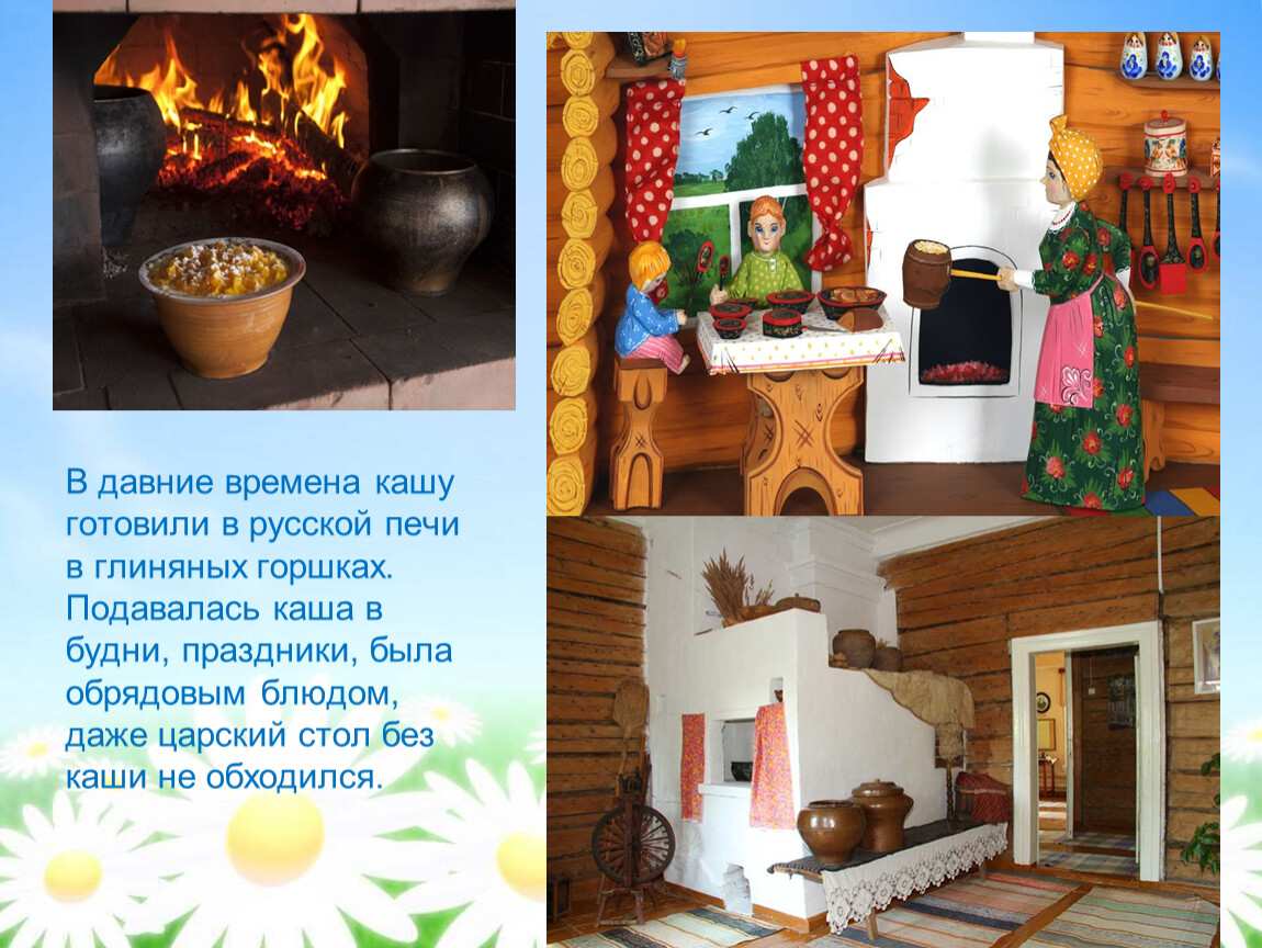 В давние времена кашу готовили в русской печи в глиняных горшках. Подавалась каша в будни, праздники, была обрядовым блюдом, даже царский стол без каши не обходился.