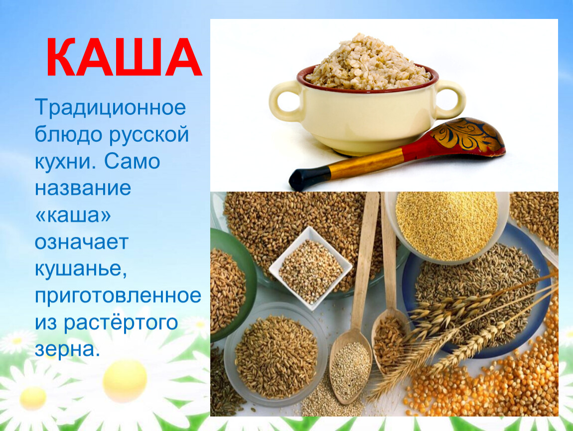 Традиционное блюдо русской кухни. Само название «каша» означает кушанье, приготовленное из растёртого зерна.