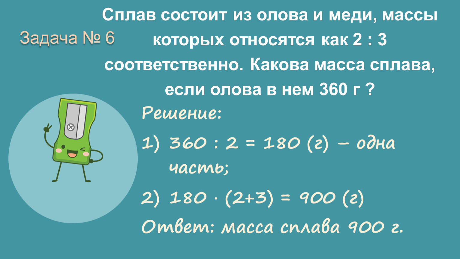 Сплав состоит из олова и меди, массы которых относятся как 2 : 3 соответственно. Какова масса сплава, если олова в нем 360 г ?