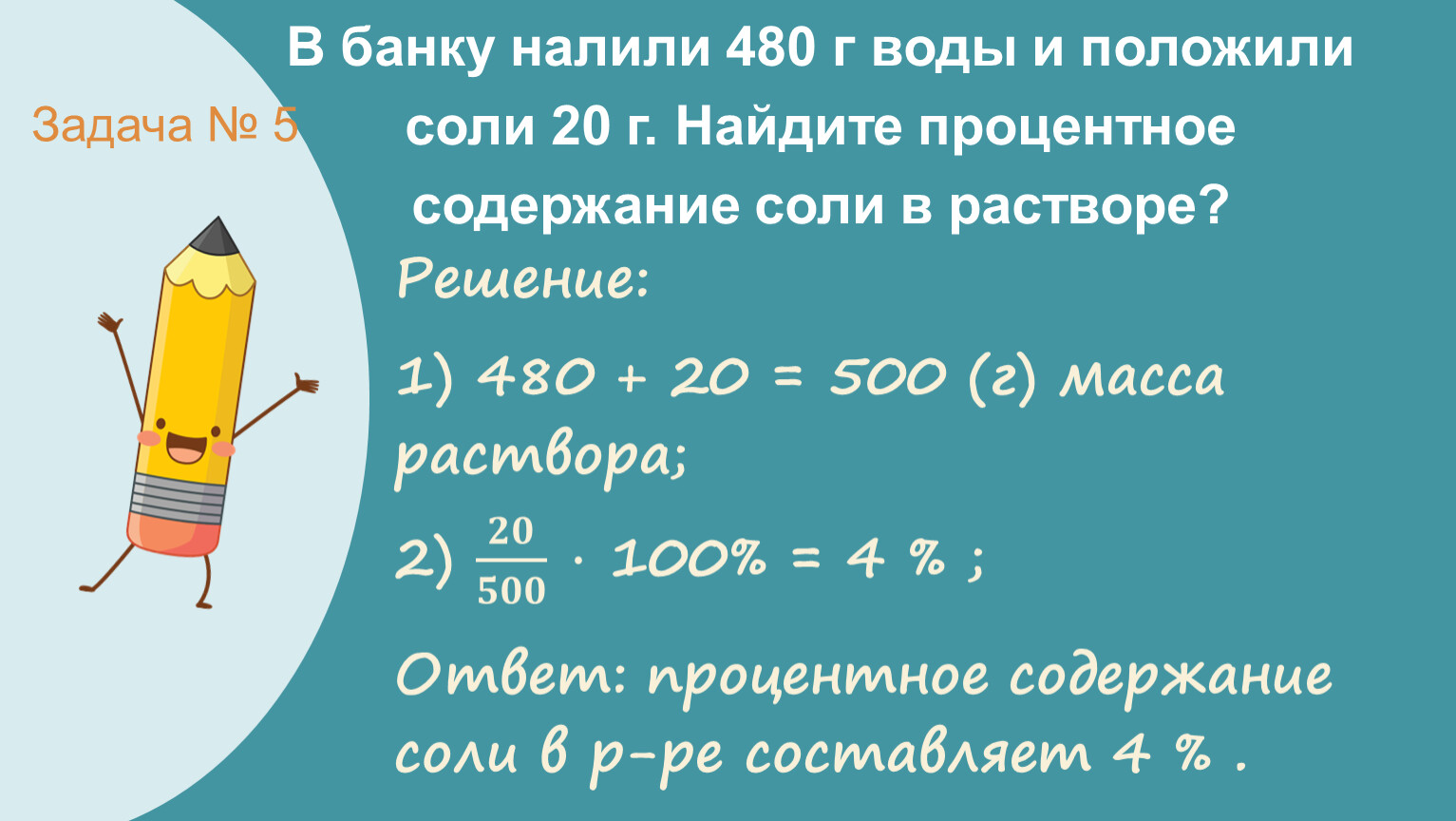 В банку налили 480 г воды и положили соли 20 г. Найдите процентное содержание соли в растворе?