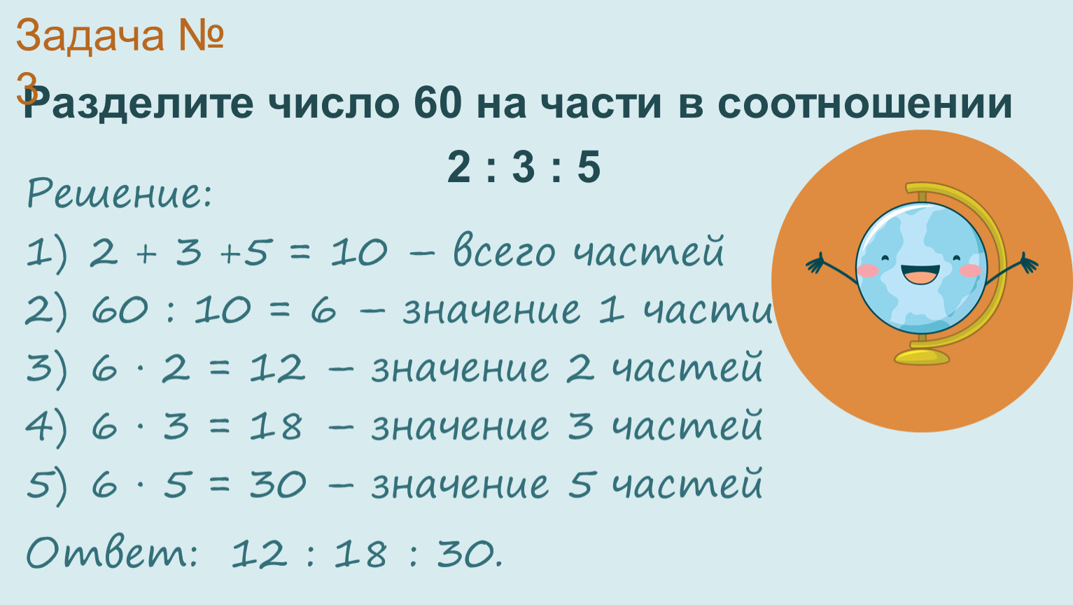 Разделите число 60 на части в соотношении 2 : 3 : 5