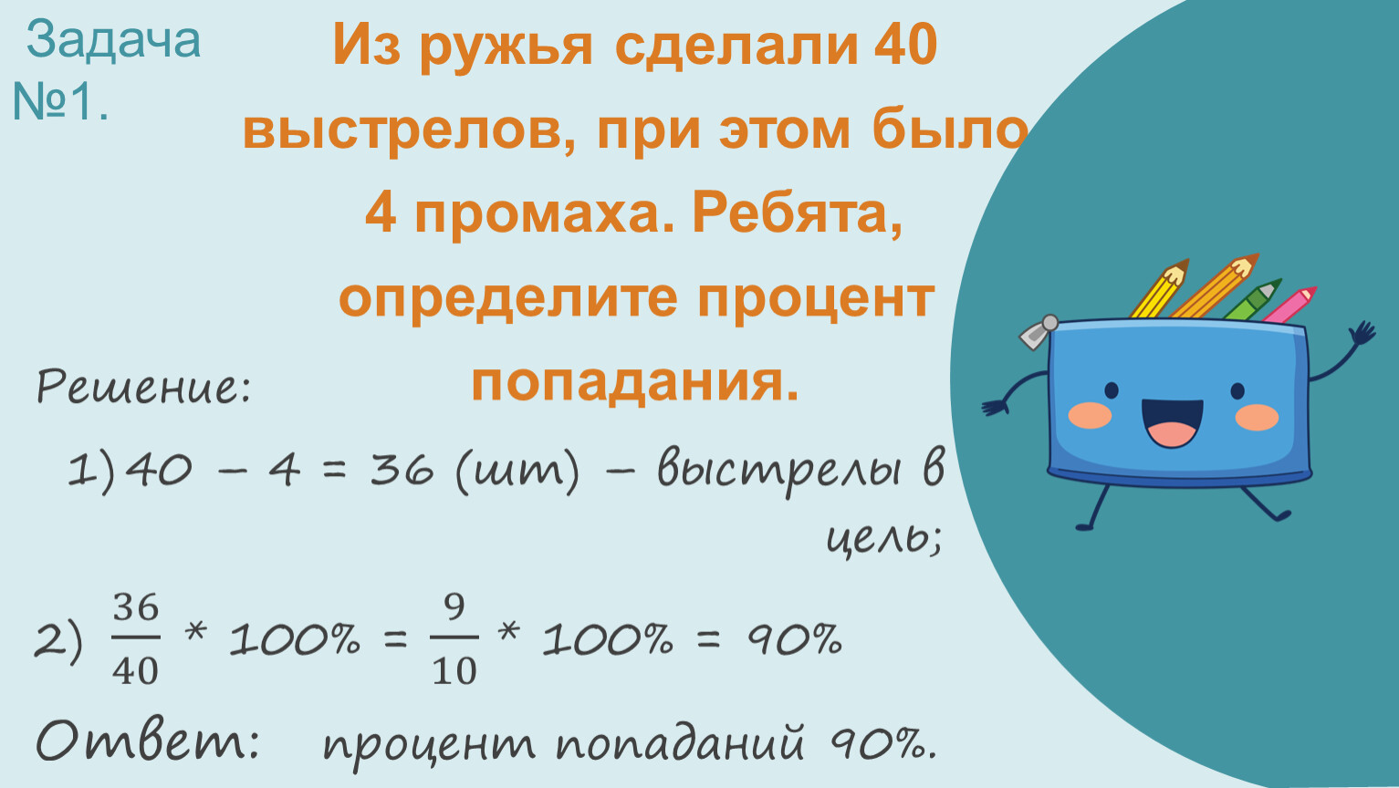 Из ружья сделали 40 выстрелов, при этом было 4 промаха. Ребята, определите процент попадания.