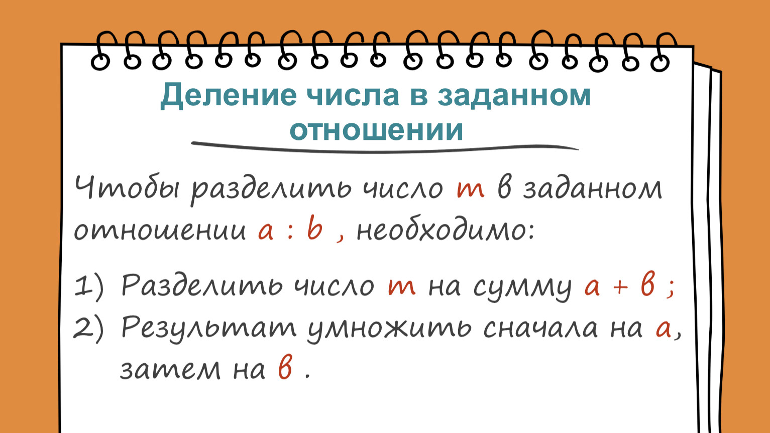 Чтобы разделить число m в заданном отношении а : b , необходимо: