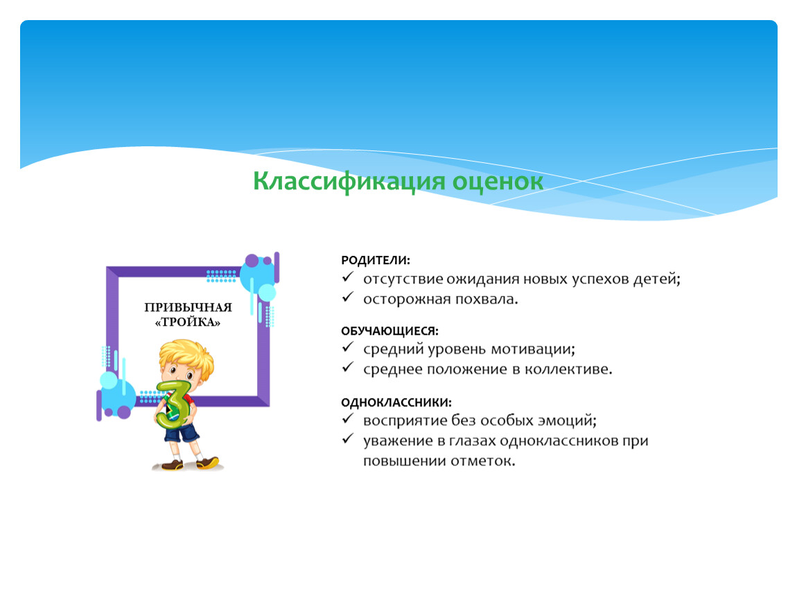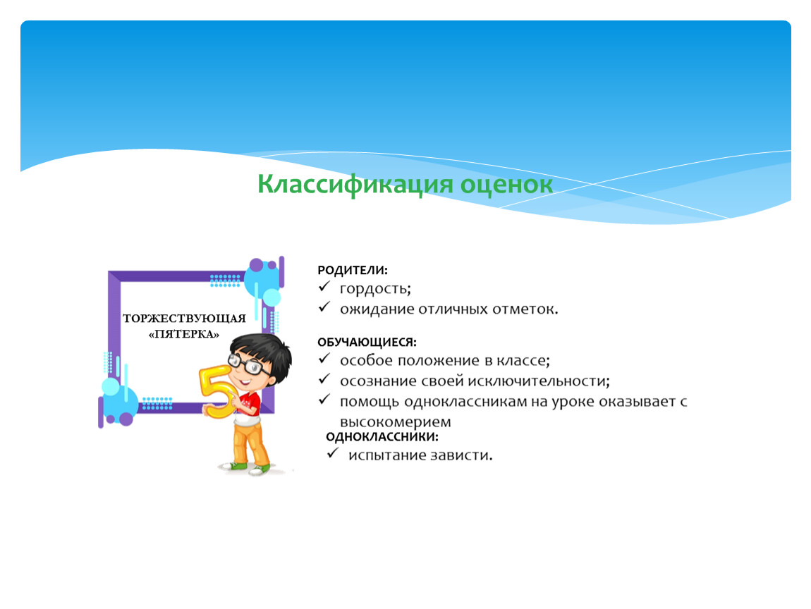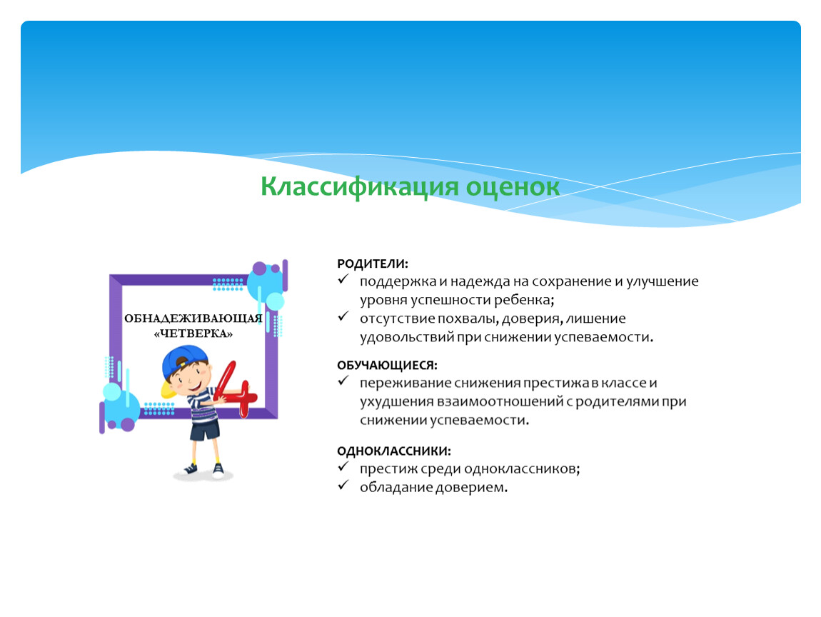 Положительные оценки способны творить чудеса: повышать самооценку ребенка и повышать его учебную мотивацию. Грамотный педагог, должен знать, что восприятие оценки детьми с завышенной или заниженной самооценкой может быть искажено. В этом случае, если отметка не соответствует их уровню притязаний или ожиданиям, дети могут встретить ее с недоверием или обидой.