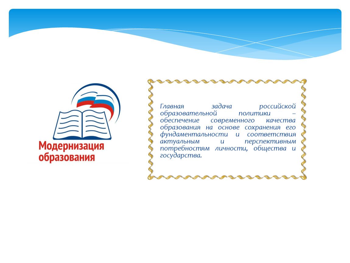 Главная задача российской образовательной политики – обеспечение современного качества образования на основе сохранения его фундаментальности и соответствия актуальным и перспективным потребностям личности, общества и государства.