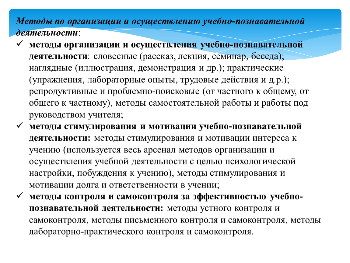 методы организации и осуществления учебно-познавательной деятельности: словесные (рассказ, лекция, семинар, беседа); наглядные (иллюстрация, демонстрация и др.); практические (упражнения, лабораторные опыты, трудовые действия и д.р.); репродуктивные и проблемно-поисковые (от частного к общему, от общего к частному), методы самостоятельной работы и работы под руководством учителя;