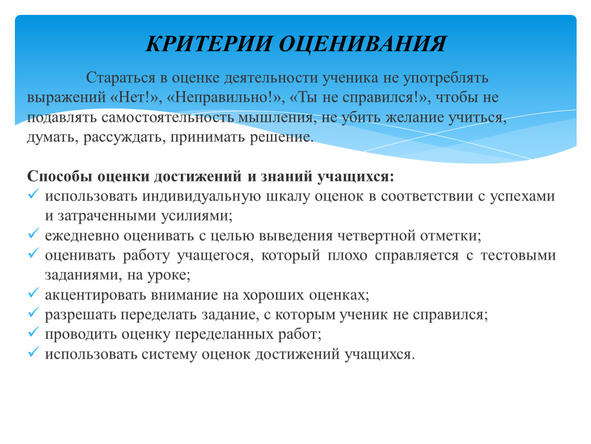 Стараться в оценке деятельности ученика не употреблять выражений «Нет!», «Неправильно!», «Ты не справился!», чтобы не подавлять самостоятельность мышления, не убить желание учиться, думать, рассуждать, принимать решение.