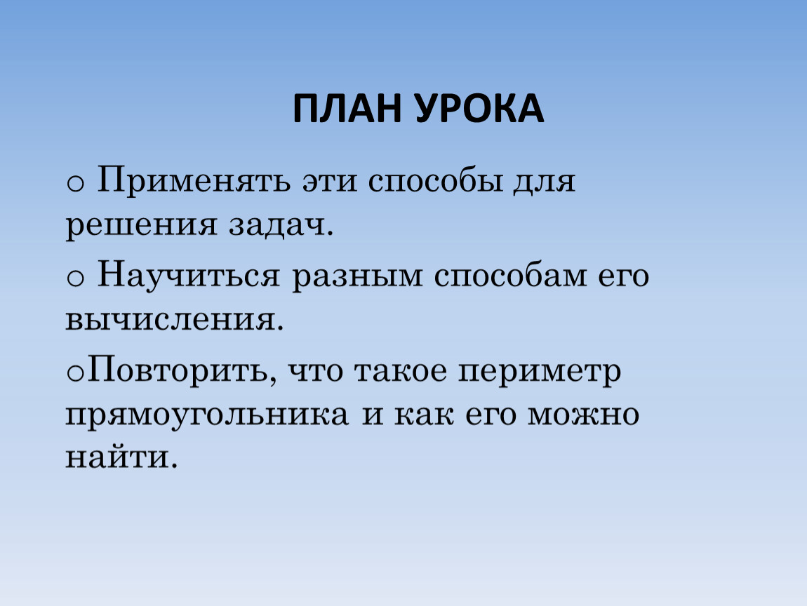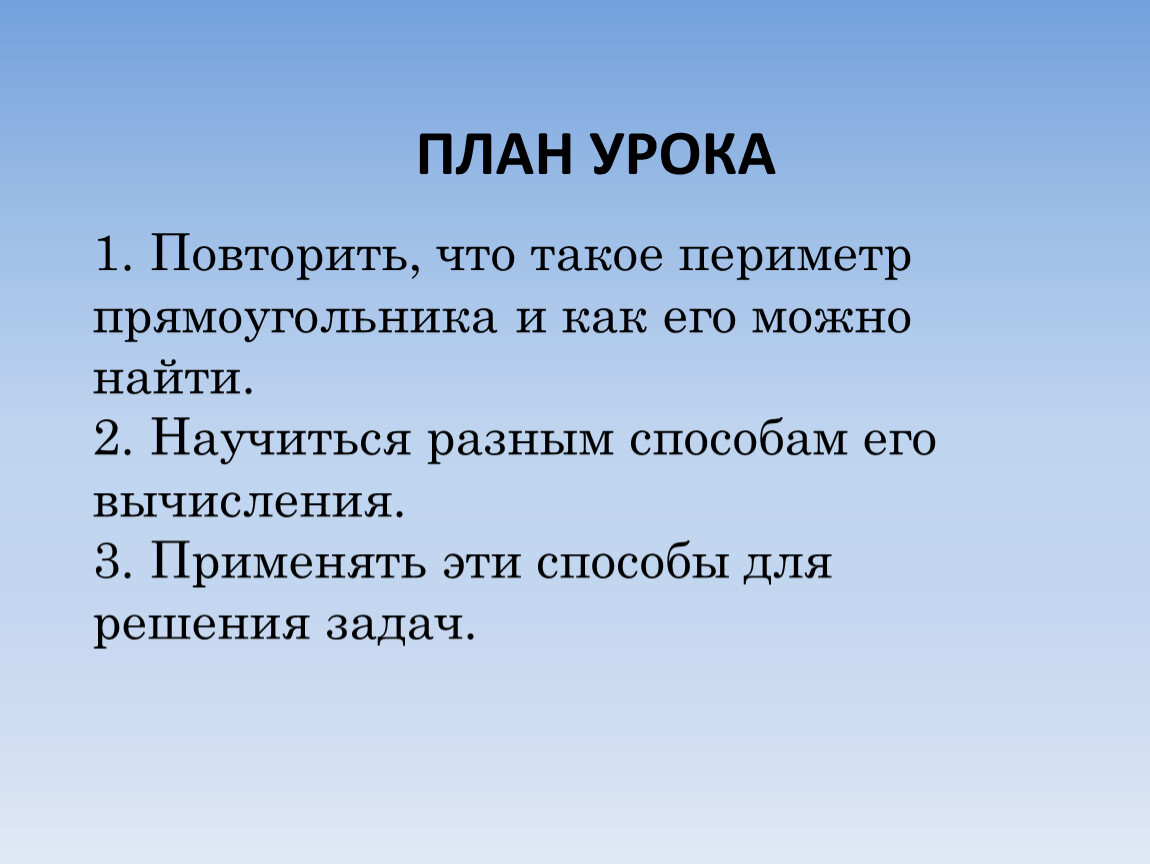 1. Повторить, что такое периметр прямоугольника и как его можно найти.2. Научиться разным способам его вычисления.3. Применять эти способы для решения задач.