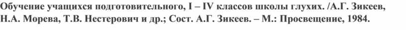 5. Обучение учащихся подготовительного, I – IV классов школы глухих. /А.Г. Зикеев, Н.А. Морева, Т.В. Нестерович и др.; Сост. А.Г. Зикеев. – М.: Просвещение, 1984.