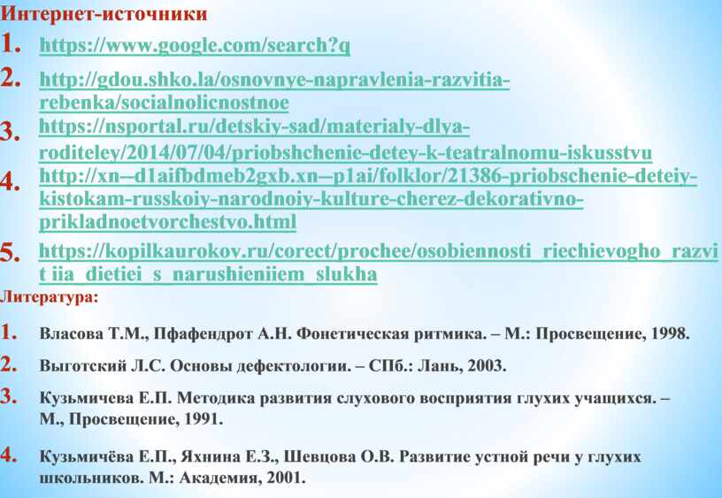 4. Кузьмичёва Е.П., Яхнина Е.З., Шевцова О.В. Развитие устной речи у глухих школьников. М.: Академия, 2001.