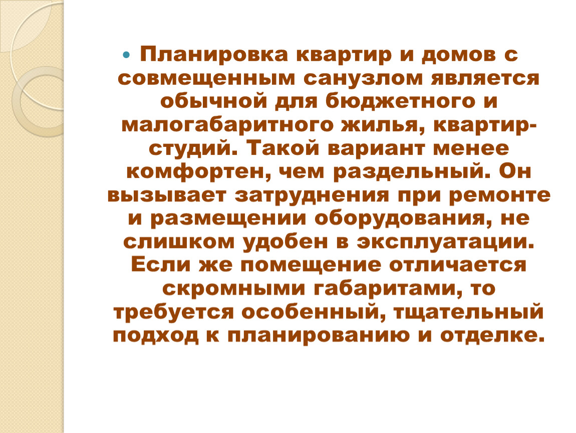 Планировка квартир и домов с совмещенным санузлом является обычной для бюджетного и малогабаритного жилья, квартир-студий. Такой вариант менее комфортен, чем раздельный. Он вызывает затруднения при ремонте и размещении оборудования, не слишком удобен в эксплуатации. Если же помещение отличается скромными габаритами, то требуется особенный, тщательный подход к планированию и отделке.