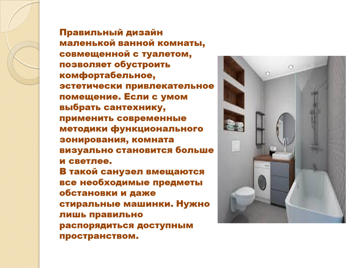 Правильный дизайн маленькой ванной комнаты, совмещенной с туалетом, позволяет обустроить комфортабельное, эстетически привлекательное помещение. Если с умом выбрать сантехнику, применить современные методики функционального зонирования, комната визуально становится больше и светлее.