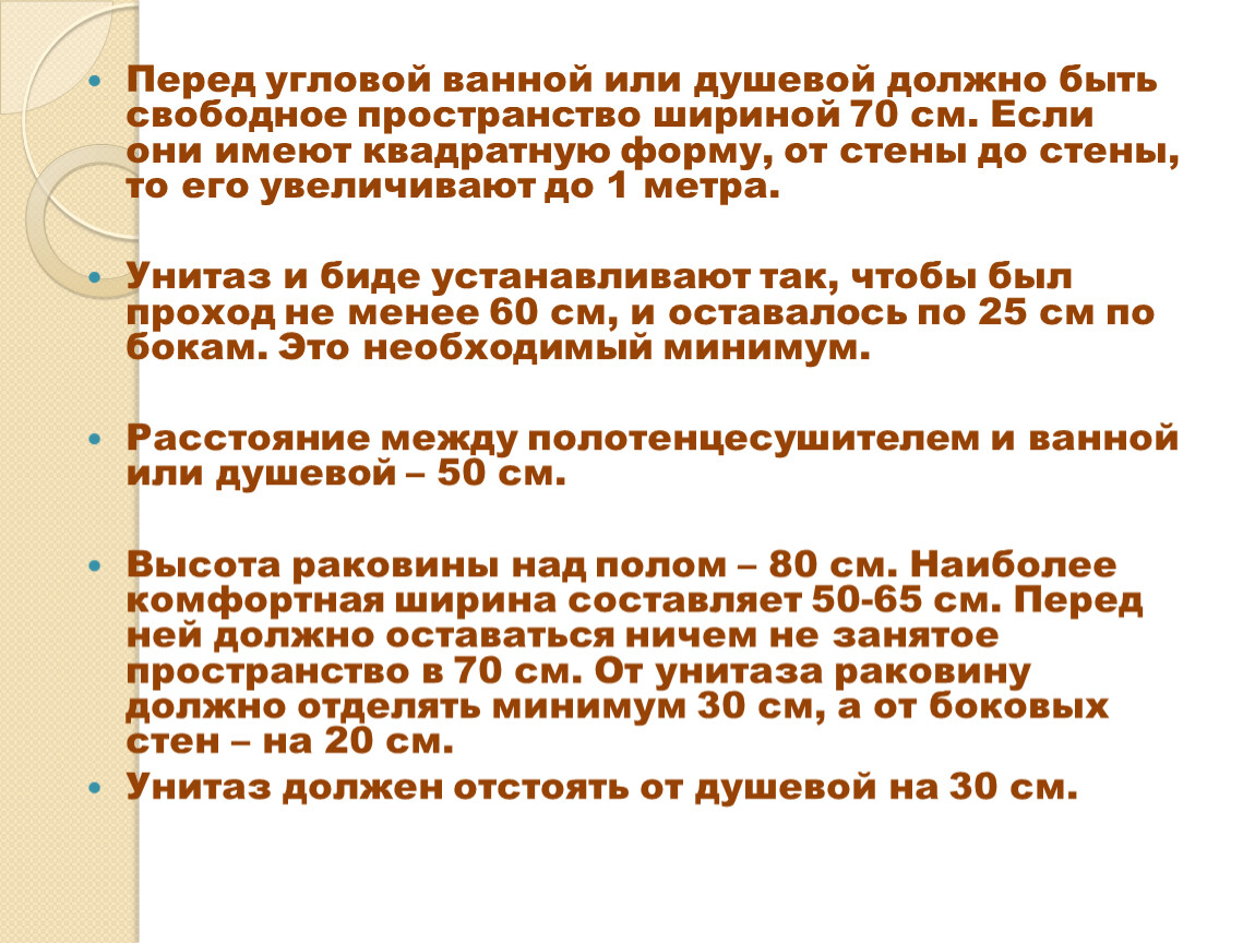 Перед угловой ванной или душевой должно быть свободное пространство шириной 70 см. Если они имеют квадратную форму, от стены до стены, то его увеличивают до 1 метра.