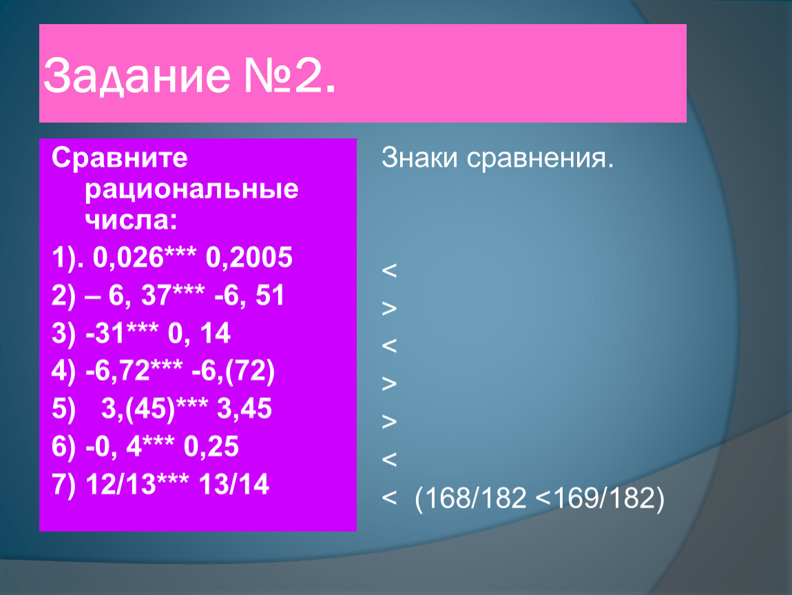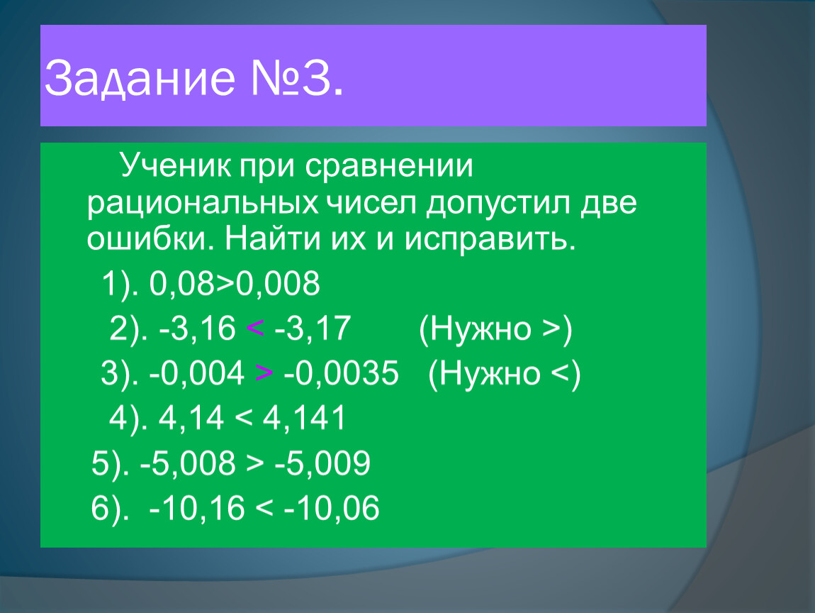 Ученик при сравнении рациональных чисел допустил две ошибки. Найти их и исправить.