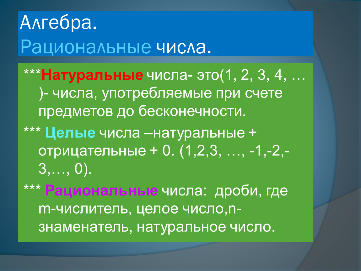 *** Рациональные числа: дроби, где m-числитель, целое число,n- знаменатель, натуральное число.