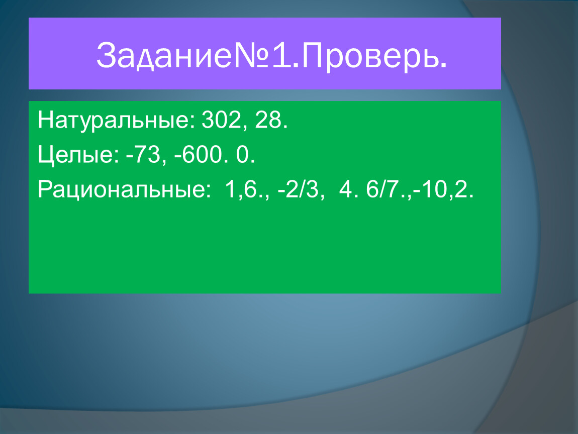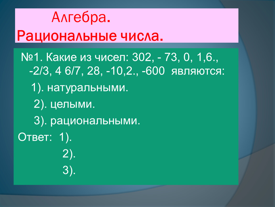 №1. Какие из чисел: 302, - 73, 0, 1,6., -2/3, 4 6/7, 28, -10,2., -600 являются: