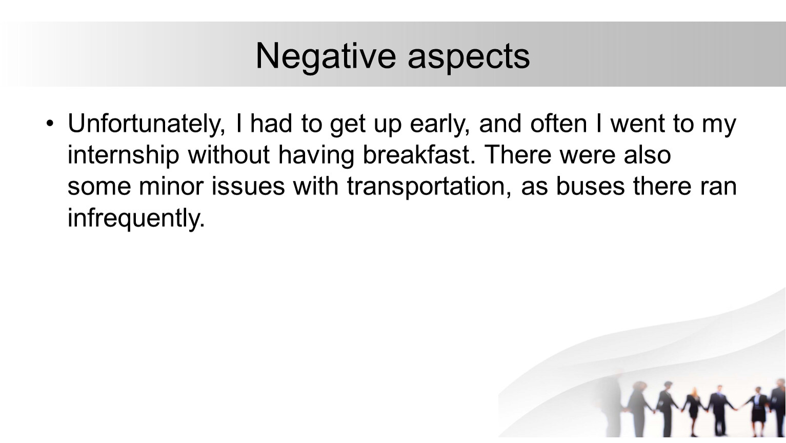 Unfortunately, I had to get up early, and often I went to my internship without having breakfast. There were also some minor issues with transportation, as buses there ran infrequently.