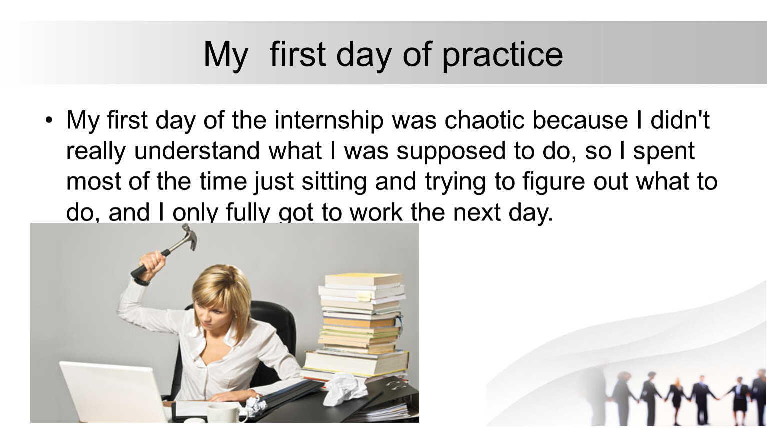 My first day of the internship was chaotic because I didn't really understand what I was supposed to do, so I spent most of the time just sitting and trying to figure out what to do, and I only fully got to work the next day.