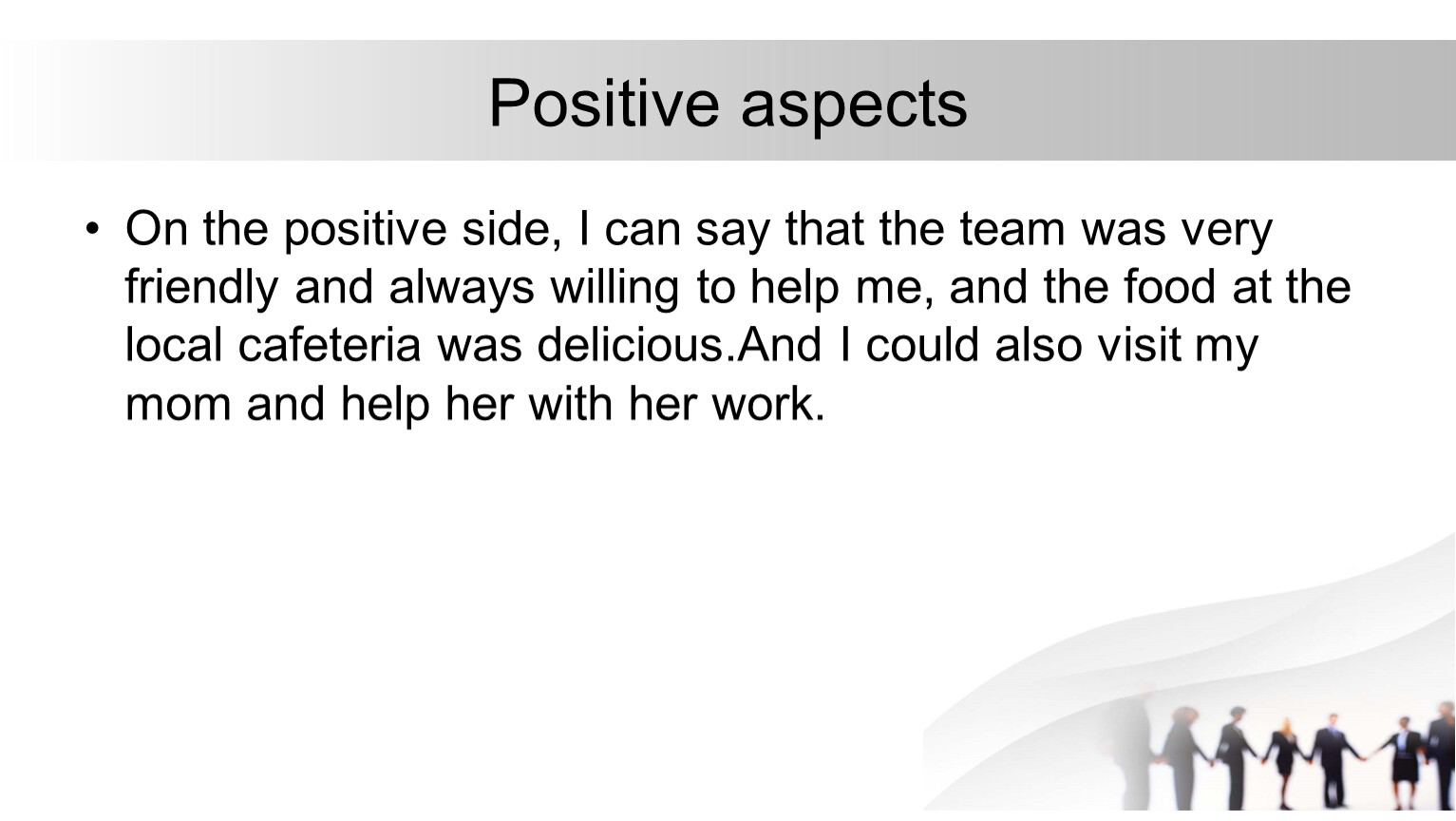 On the positive side, I can say that the team was very friendly and always willing to help me, and the food at the local cafeteria was delicious.And I could also visit my mom and help her with her work.