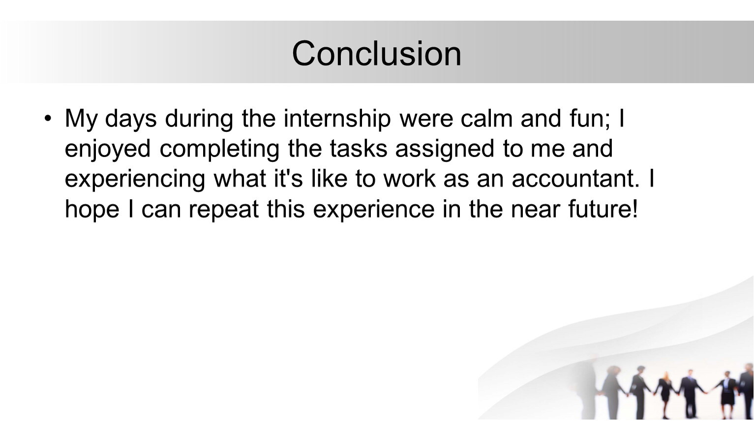 My days during the internship were calm and fun; I enjoyed completing the tasks assigned to me and experiencing what it's like to work as an accountant. I hope I can repeat this experience in the near future!