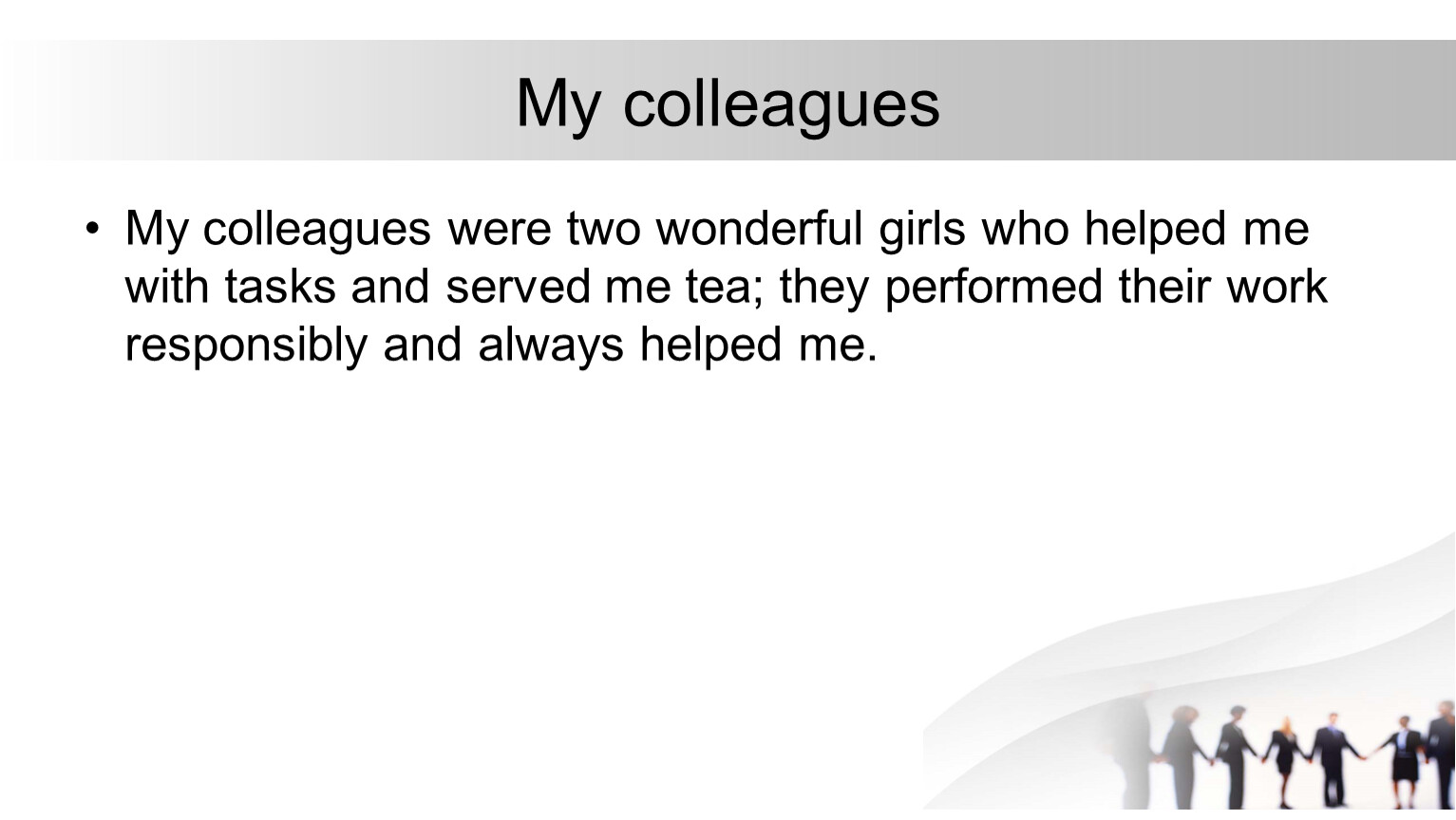 My colleagues were two wonderful girls who helped me with tasks and served me tea; they performed their work responsibly and always helped me.