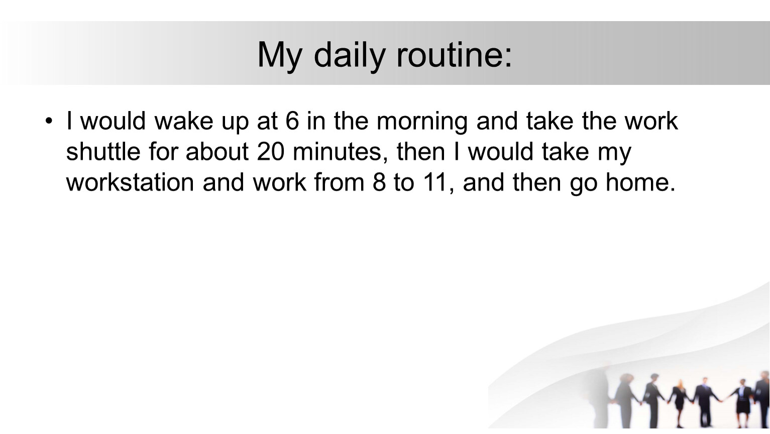 I would wake up at 6 in the morning and take the work shuttle for about 20 minutes, then I would take my workstation and work from 8 to 11, and then go home.
