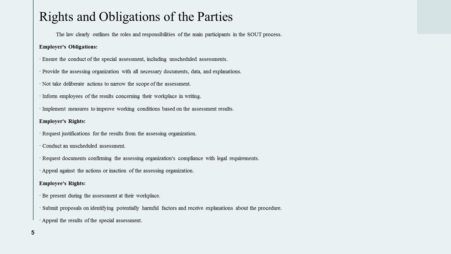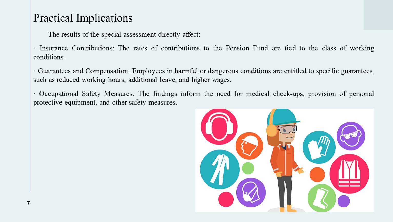 Its main purpose is to shift from a generic approach to providing guarantees and compensation to workers, towards an assessment based on the actual impact of harmful and dangerous factors on an employee. The results of this assessment have wide-ranging implications, including determining insurance premium rates for the Pension Fund, providing guarantees and compensations to employees, and informing various occupational safety procedures.