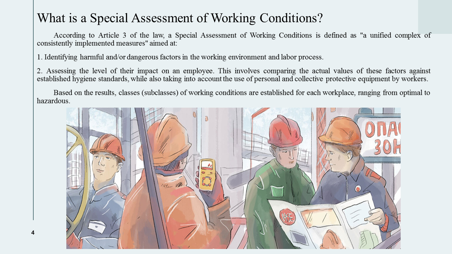 According to Article 3 of the law, a Special Assessment of Working Conditions is defined as "a unified complex of consistently implemented measures" aimed at: