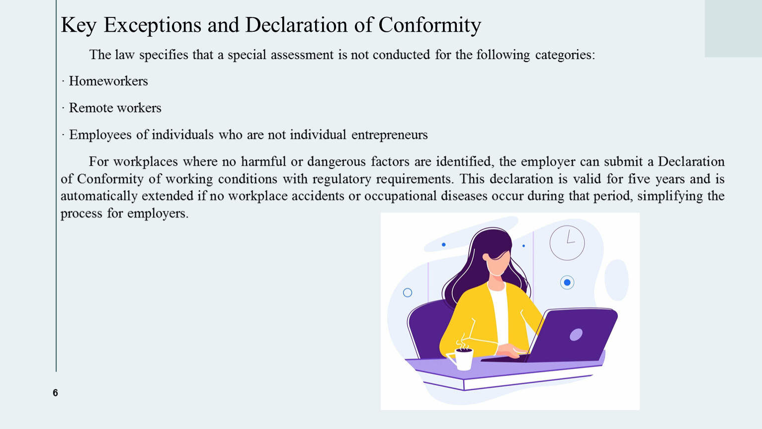 For workplaces where no harmful or dangerous factors are identified, the employer can submit a Declaration of Conformity of working conditions with regulatory requirements. This declaration is valid for five years and is automatically extended if no workplace accidents or occupational diseases occur during that period, simplifying the process for employers.