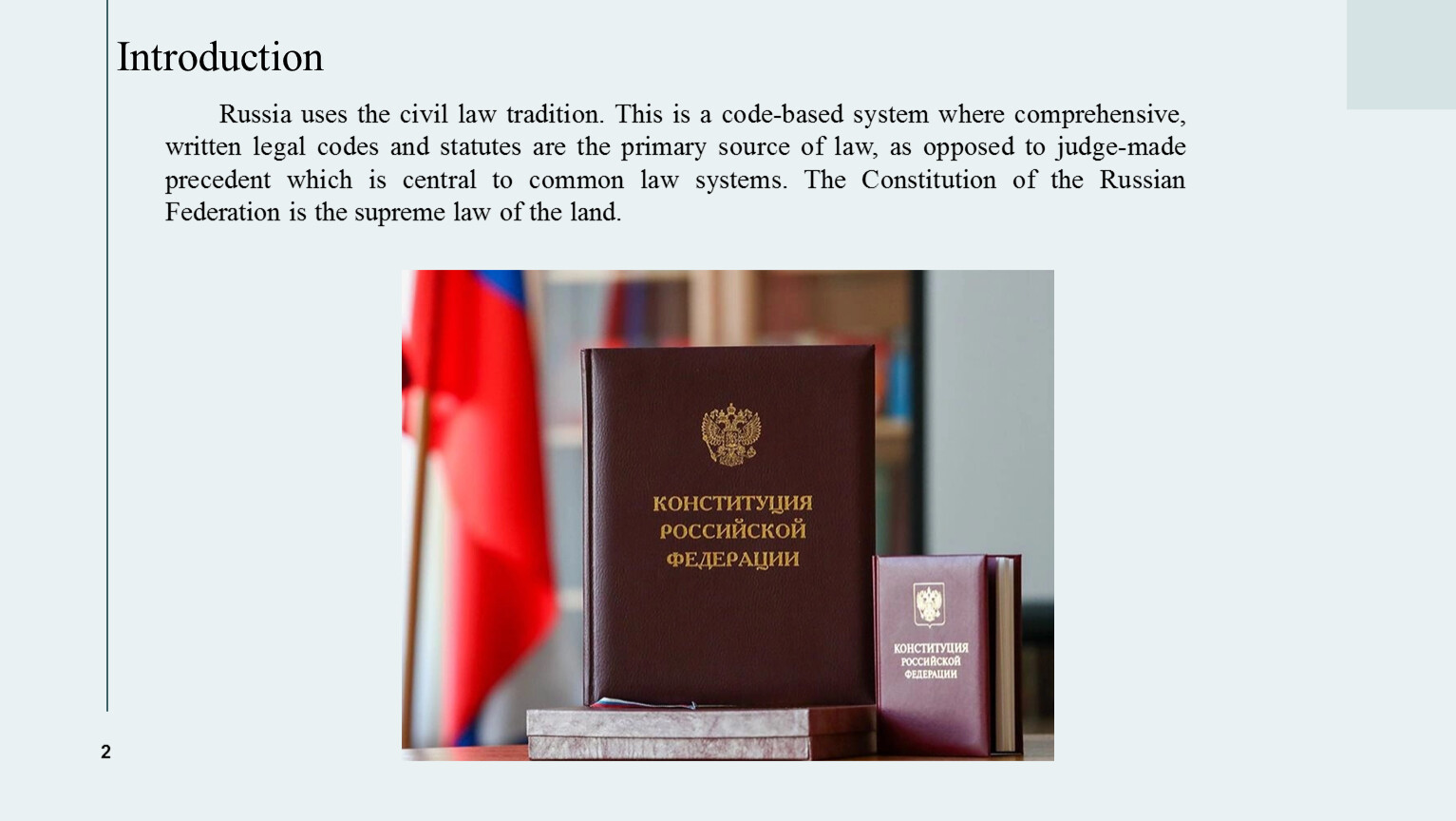 Russia uses the civil law tradition. This is a code-based system where comprehensive, written legal codes and statutes are the primary source of law, as opposed to judge-made precedent which is central to common law systems. The Constitution of the Russian Federation is the supreme law of the land.