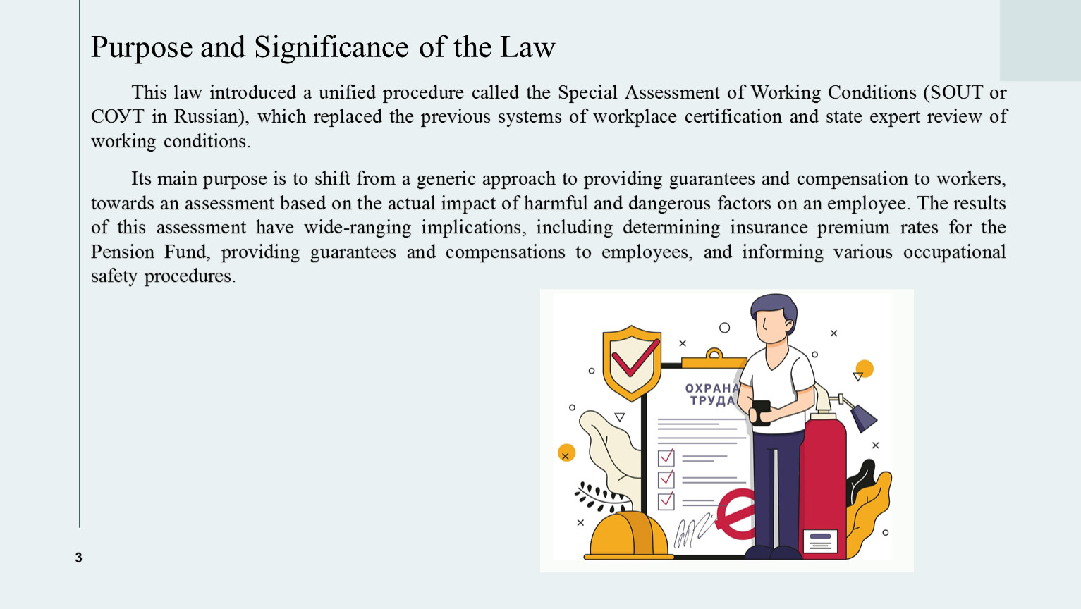 This law introduced a unified procedure called the Special Assessment of Working Conditions (SOUT or СОУТ in Russian), which replaced the previous systems of workplace certification and state expert review of working conditions.