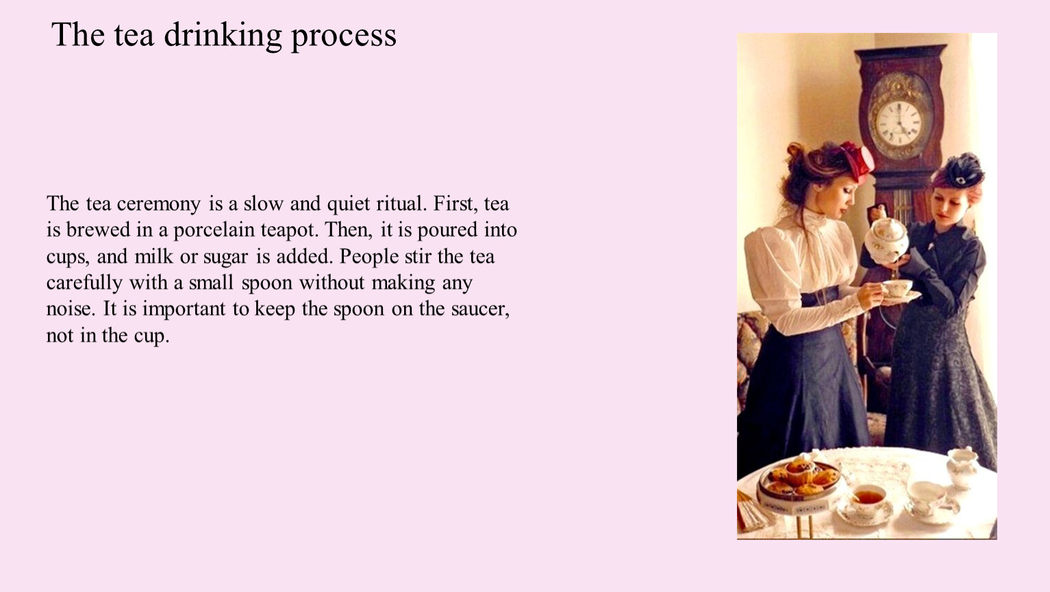 The tea ceremony is a slow and quiet ritual. First, tea is brewed in a porcelain teapot. Then, it is poured into cups, and milk or sugar is added. People stir the tea carefully with a small spoon without making any noise. It is important to keep the spoon on the saucer, not in the cup.