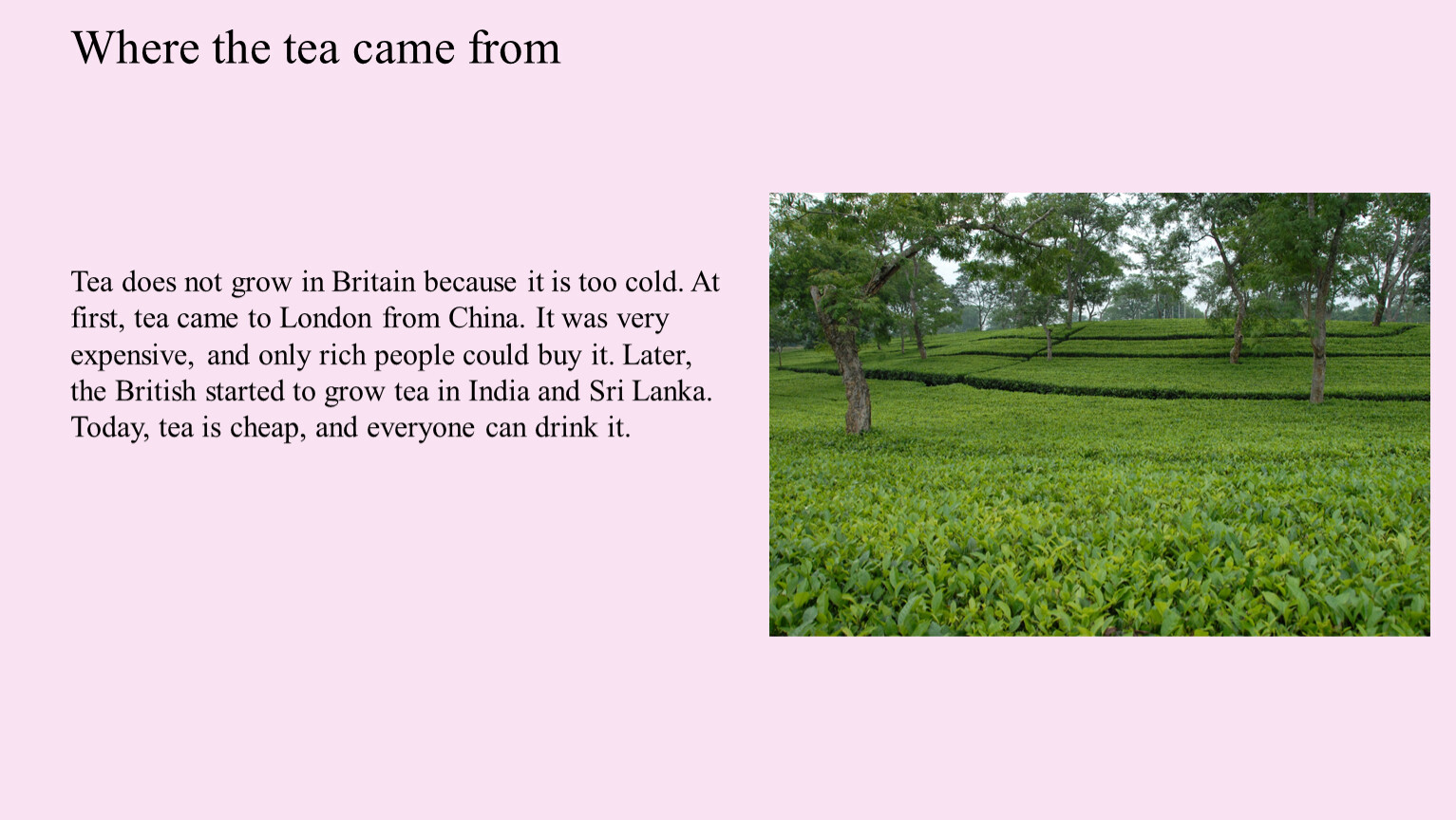 Tea does not grow in Britain because it is too cold. At first, tea came to London from China. It was very expensive, and only rich people could buy it. Later, the British started to grow tea in India and Sri Lanka. Today, tea is cheap, and everyone can drink it.