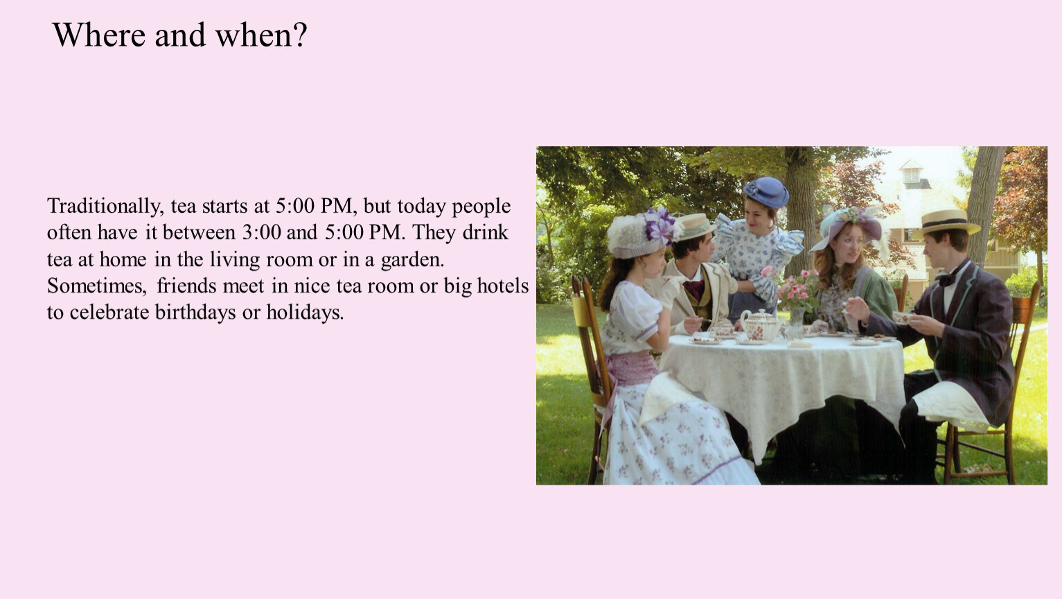 Traditionally, tea starts at 5:00 PM, but today people often have it between 3:00 and 5:00 PM. They drink tea at home in the living room or in a garden. Sometimes, friends meet in nice tea room or big hotels to celebrate birthdays or holidays.