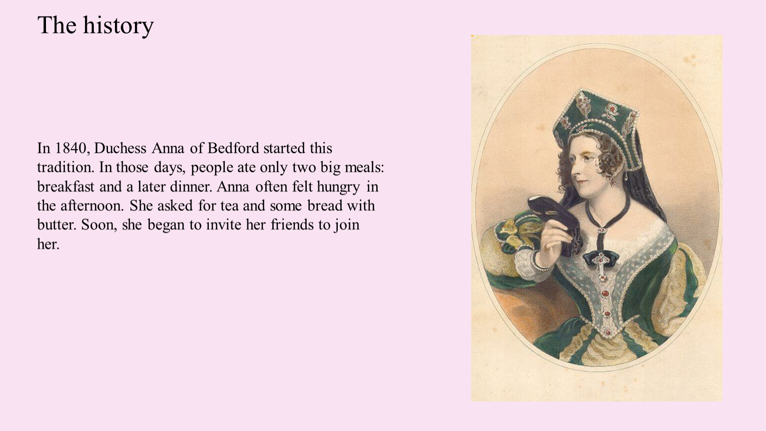 In 1840, Duchess Anna of Bedford started this tradition. In those days, people ate only two big meals: breakfast and a later dinner. Anna often felt hungry in the afternoon. She asked for tea and some bread with butter. Soon, she began to invite her friends to join her.