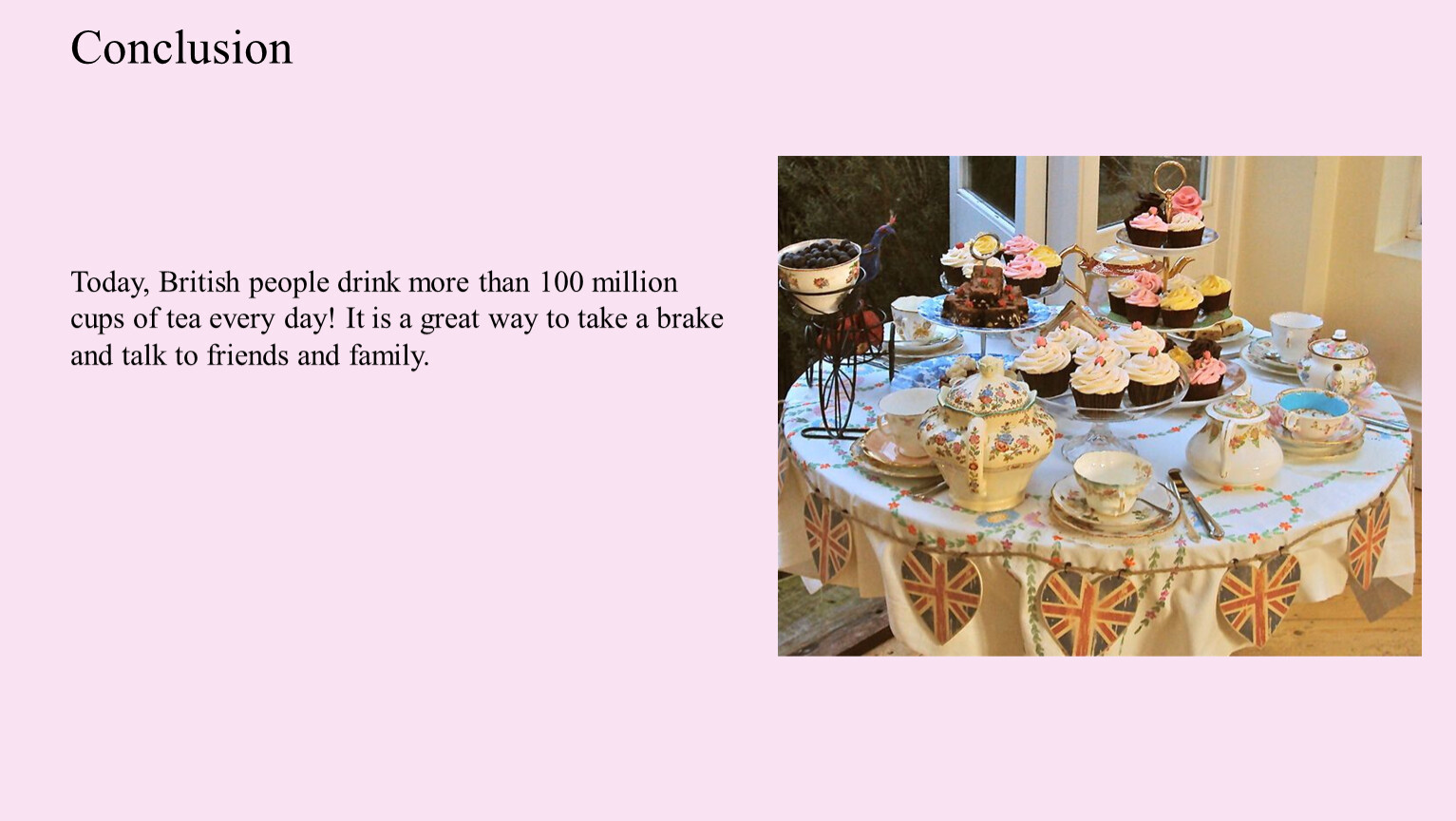 Today, British people drink more than 100 million cups of tea every day! It is a great way to take a brake and talk to friends and family.