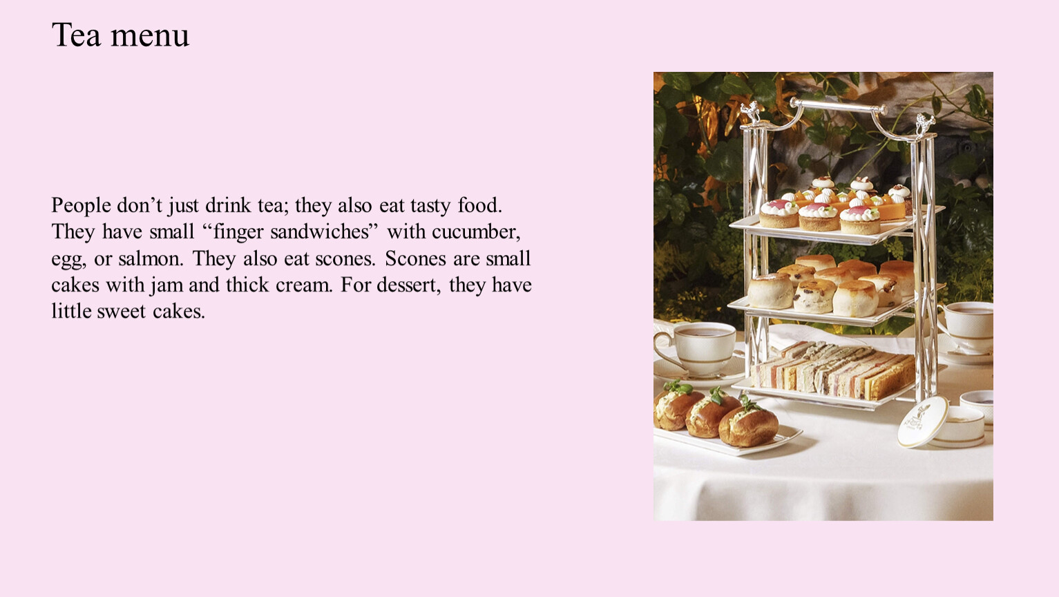 People don’t just drink tea; they also eat tasty food. They have small “finger sandwiches” with cucumber, egg, or salmon. They also eat scones. Scones are small cakes with jam and thick cream. For dessert, they have little sweet cakes.
