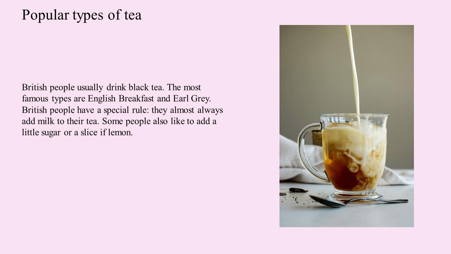 British people usually drink black tea. The most famous types are English Breakfast and Earl Grey. British people have a special rule: they almost always add milk to their tea. Some people also like to add a little sugar or a slice if lemon.