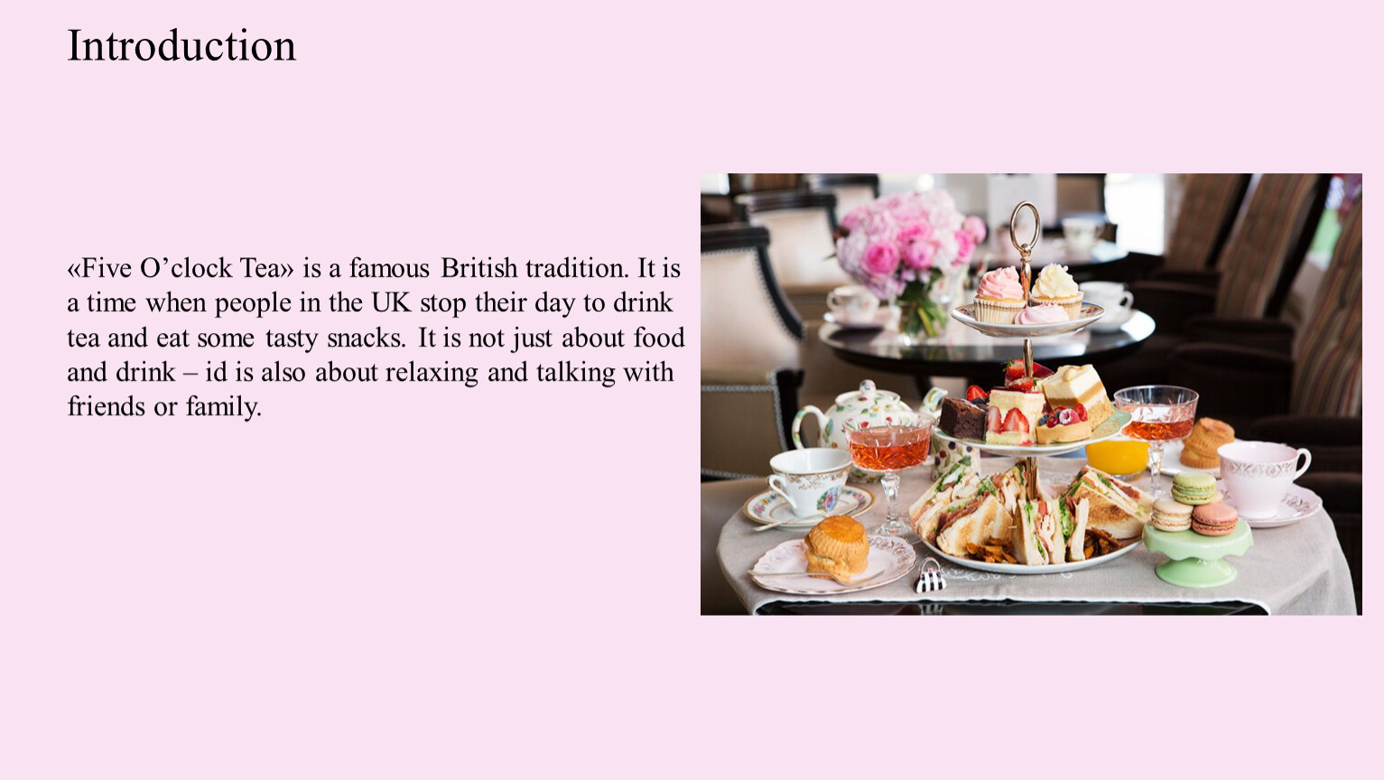 «Five O’clock Tea» is a famous British tradition. It is a time when people in the UK stop their day to drink tea and eat some tasty snacks. It is not just about food and drink – id is also about relaxing and talking with friends or family.