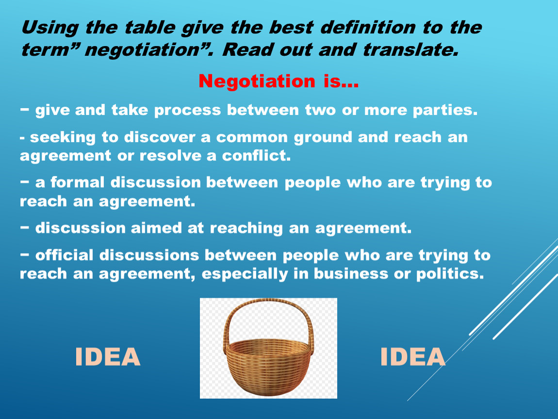 Using the table give the best definition to the term” negotiation”. Read out and translate.
