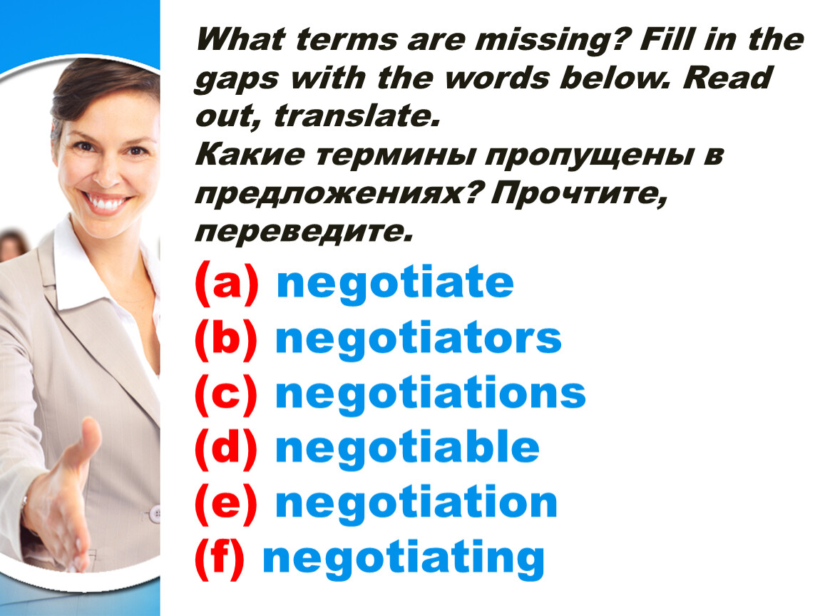 What terms are missing? Fill in the gaps with the words below. Read out, translate.Какие термины пропущены в предложениях? Прочтите, переведите.(a) negotiate(b) negotiators(c) negotiations(d) negotiable(e) negotiation(f) negotiating