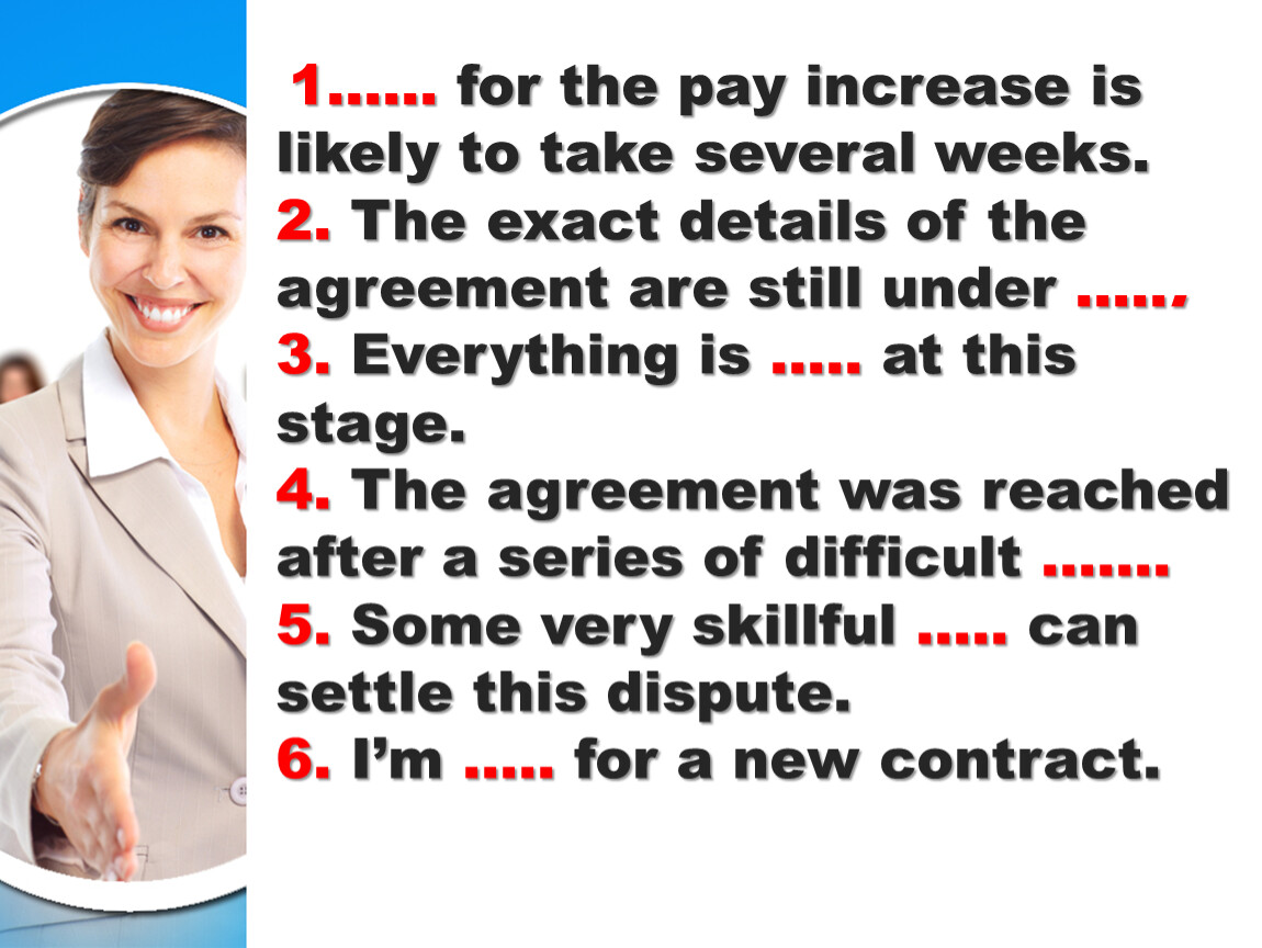 1…… for the pay increase is likely to take several weeks.2. The exact details of the agreement are still under …...3. Everything is ….. at this stage.4. The agreement was reached after a series of difficult …….5. Some very skillful ….. can settle this dispute.6. I’m ….. for a new contract.